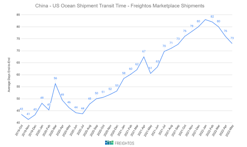 Likewise, conditions at LA/Long Beach ports have improved over the last two months, marketplace data show that average China – US ocean transit times have steadily fallen by 12% since the start of the year.